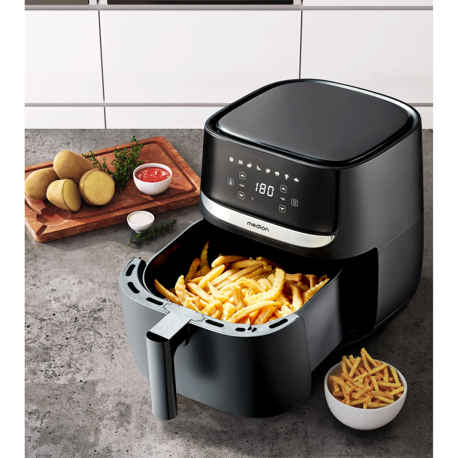 Svježi pomfrit, prozračna i ukusna torta od sira ili hrskavi pileći nuggeti – s ovom E50 XL modernom vrućom zračnom fritezom od MEDION-a sve to i više možeš pripremiti. Ovaj kuhinjski pomoćnik je kulinarski majstor i omogućava ti pripremu brojnih recepata u jednom uređaju. Pečeš ribu, pržiš pohane odreske i steakove, pečeš peciva za obiteljski doručak ili pripremaš ukusne variva. Tvoja mašta nema granica, jer ovaj multitalent može mnogo više od klasične friteze!