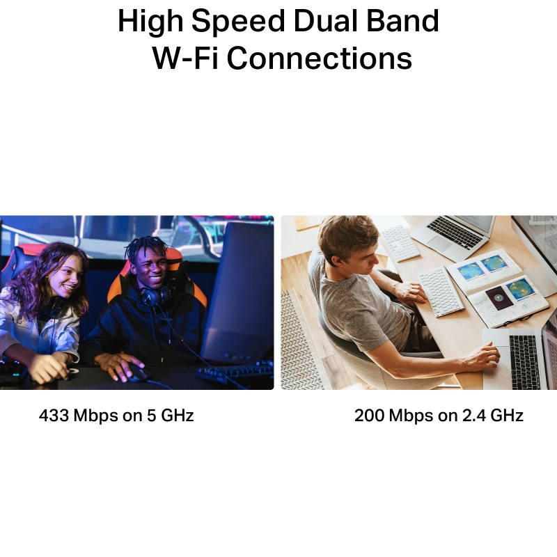 – Speeds up to 433 Mbps (5 GHz) + 200 Mbps (2.4 GHz)